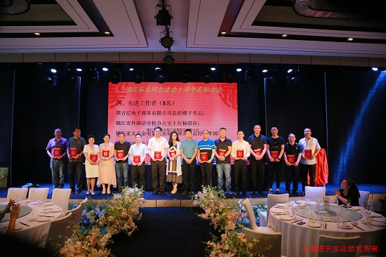会议对十年来商会建设中作出突出贡献,坚持创业创新,积极参加公益、慈善活动的20名同志进行了表彰奖励,其中江苏诺天环保设备制造有限公司被选举为“镇江东北商会常务副会长单位”,并授予“创业明星奖”。中共镇江市委统战部常务副部长徐建锋先生和镇江新区税务局副局长李月兰女士亲自授牌颁奖。